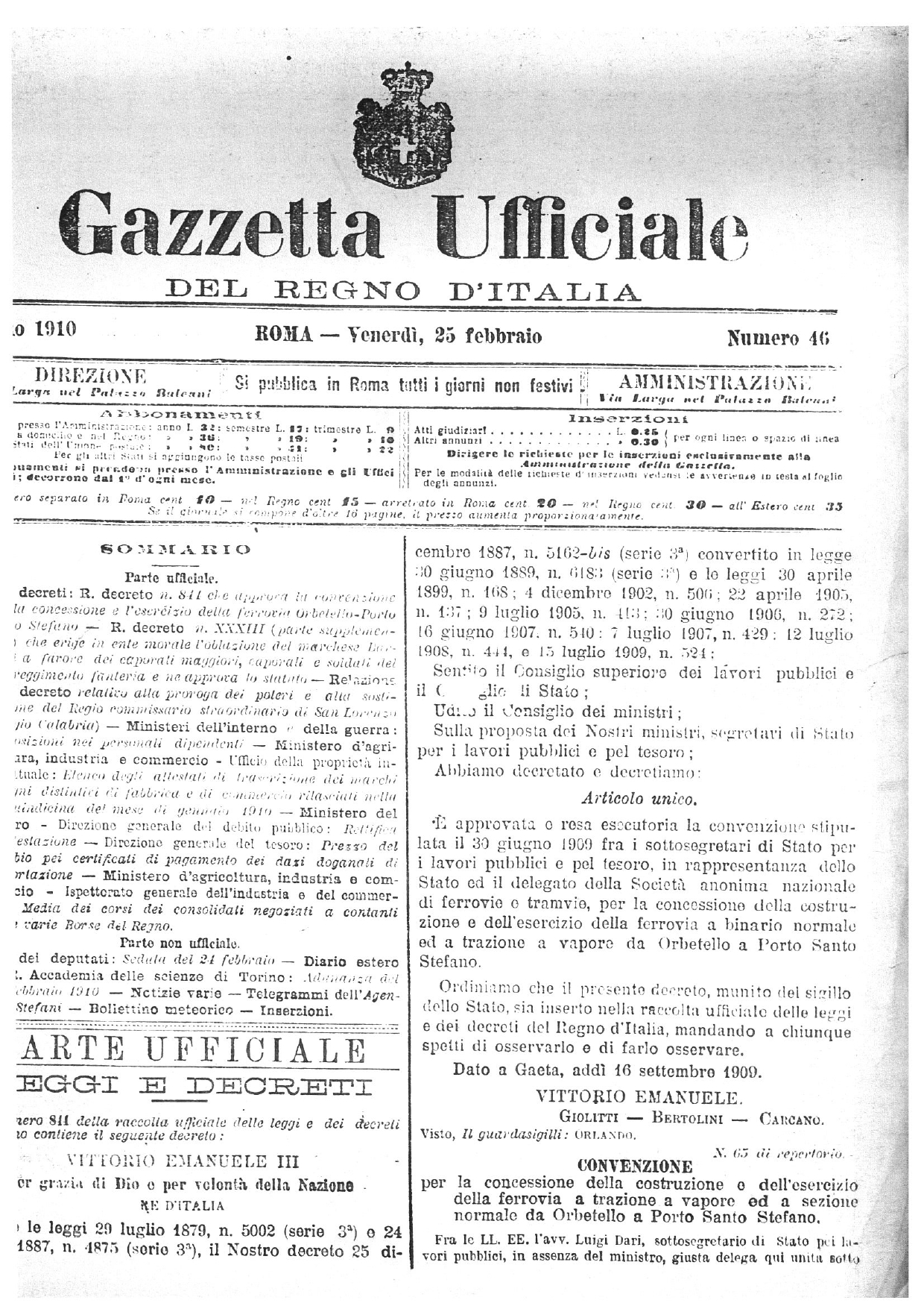 Concessione linea Orbetello-Porto S.Stefano, 1910