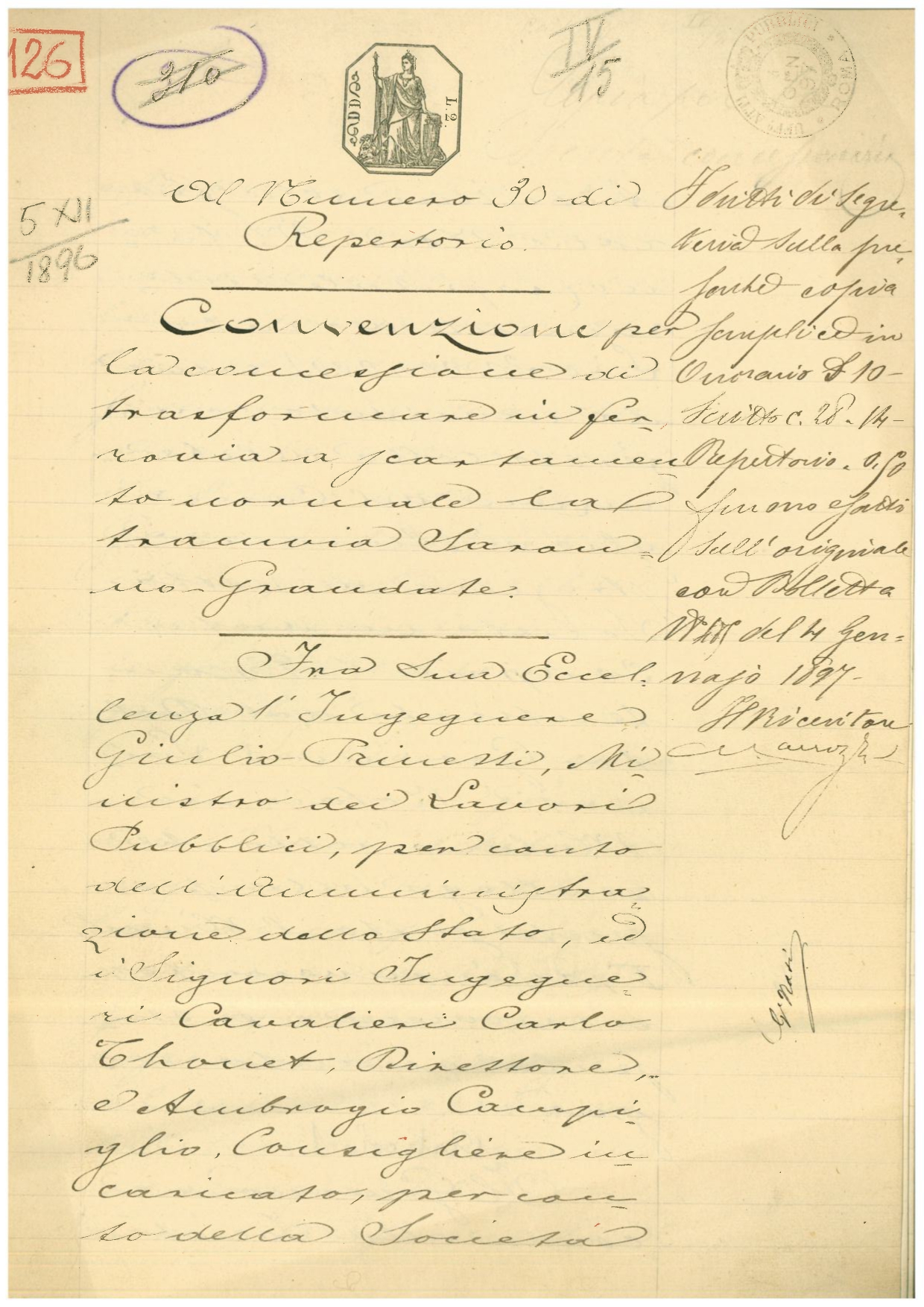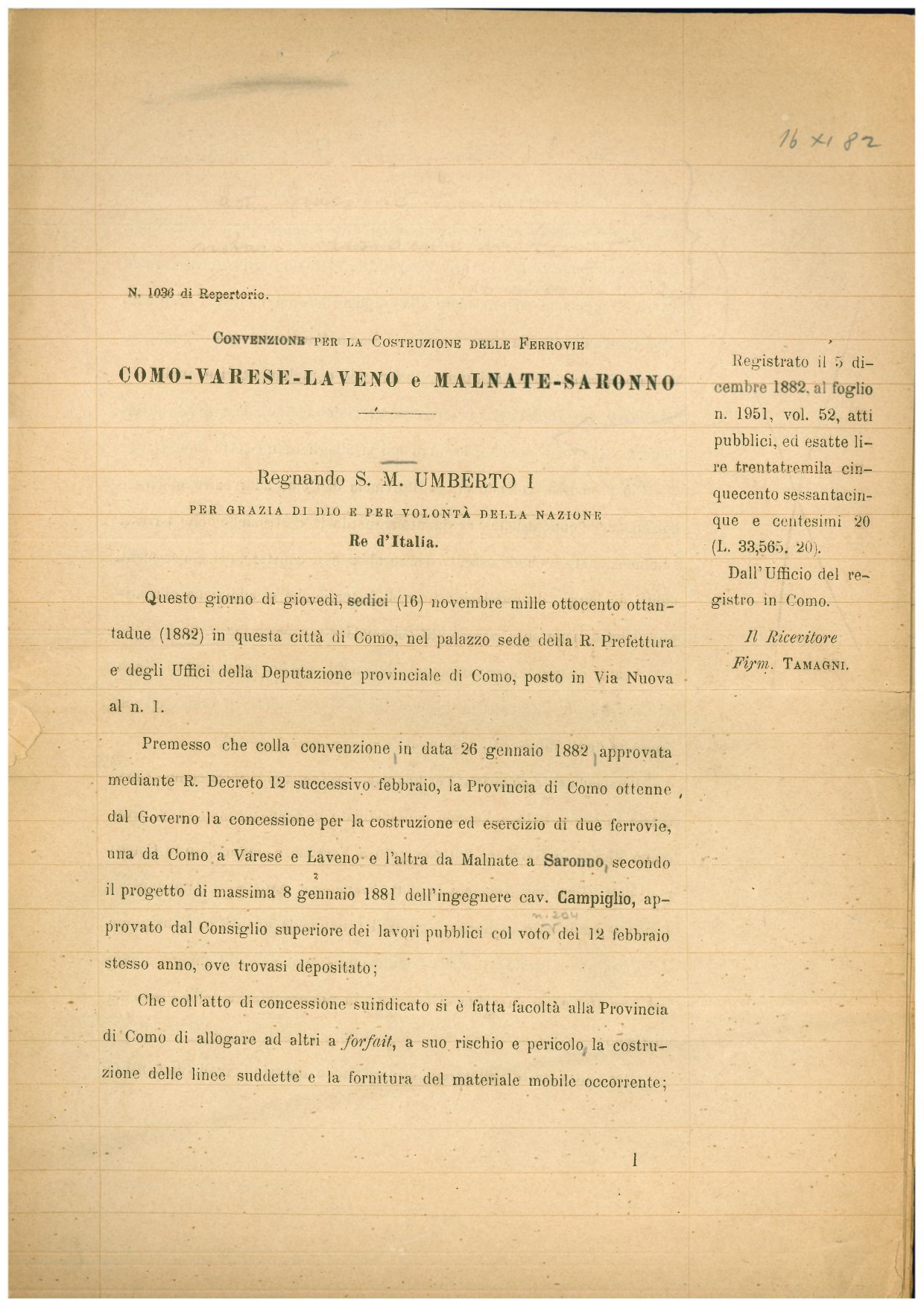 Convenzione trasformazione della tramvia Saronno-Grandate in ferrovia, 1896
